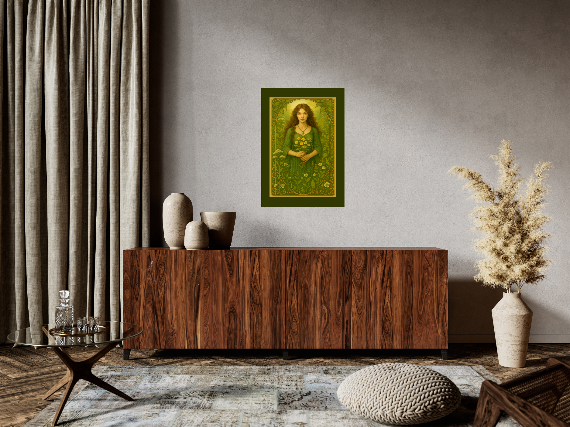 Med blicken fylld av närvaro och händerna varsamt hållande en bukett sommarblommor – smörblomma, prästkrage, rölleka och groblad – står hon som en levande växtgudinna, mitt i ett hav av helande grönska. Denna illustration är en hyllning till den läkande kraft som finns i både naturen och i dig.